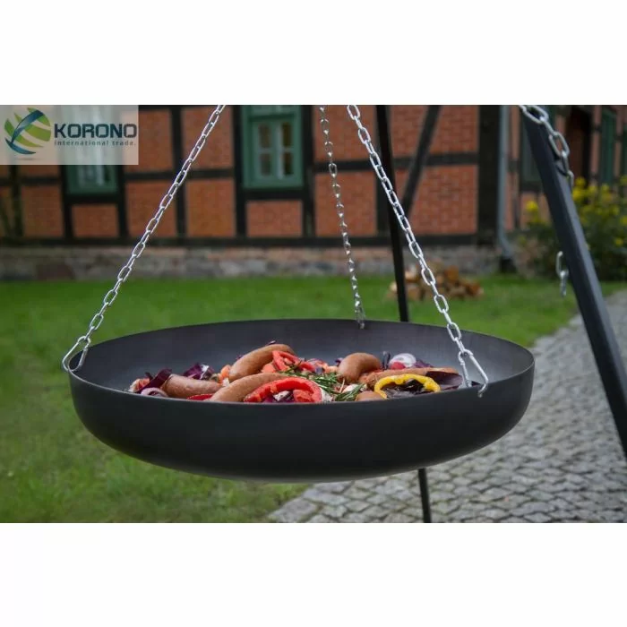 Omschrijving | Bakken en braden in je tuin boven een vuurschaal is helemaal hot. Voor bbcooking kun je deze stalen wok van 60 cm doorsnede gebruiken om heerlijke gerechten te maken. Zo kun je een flinke hoeveelheid in een keer maken voor alle gezinsleden of gasten. De wok is aan een driepoot boven een vuurschaal te bevestigen (driepoot en vuurschaal niet inbegrepen). De wok is 60 cm doorsnede, ca. 15 cm hoog en weegt ca. 6,5 kg. |